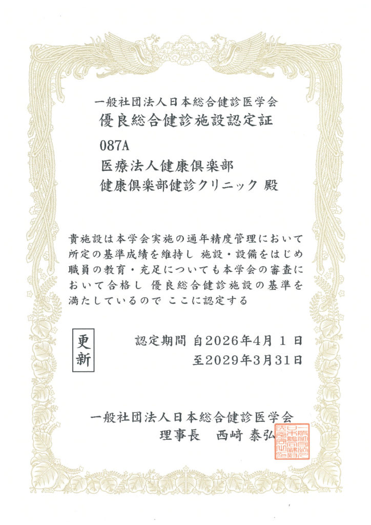 日本総合健診医学会における「優良総合健診施設認定事業所」の認定が更新されました。